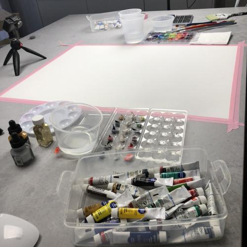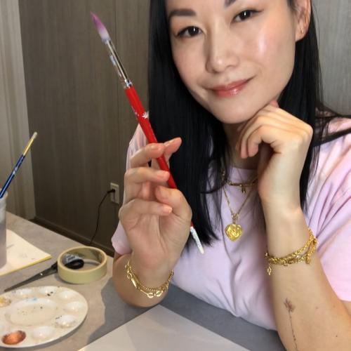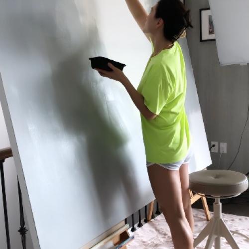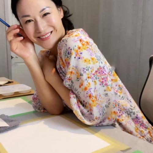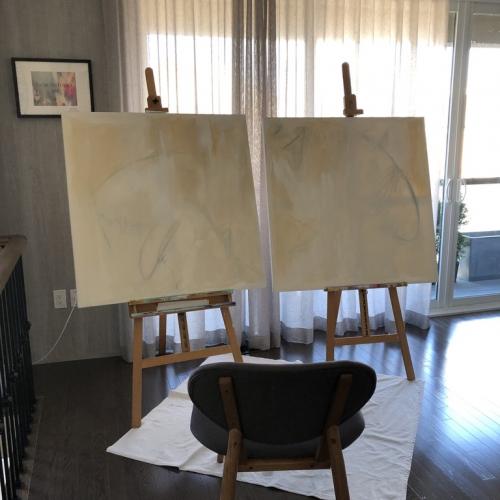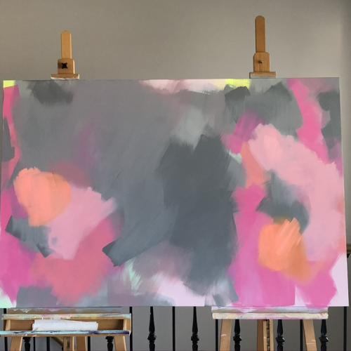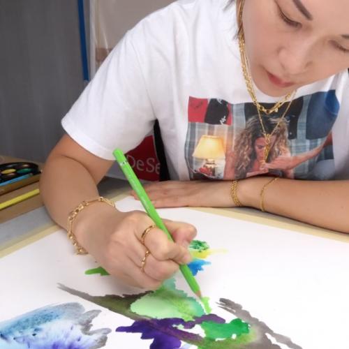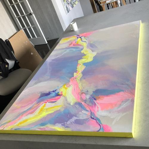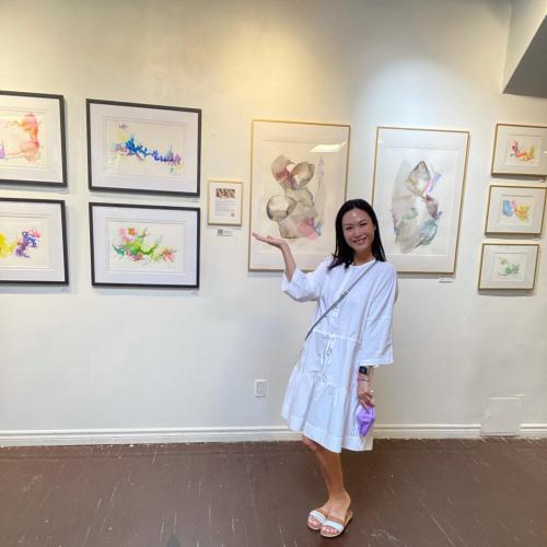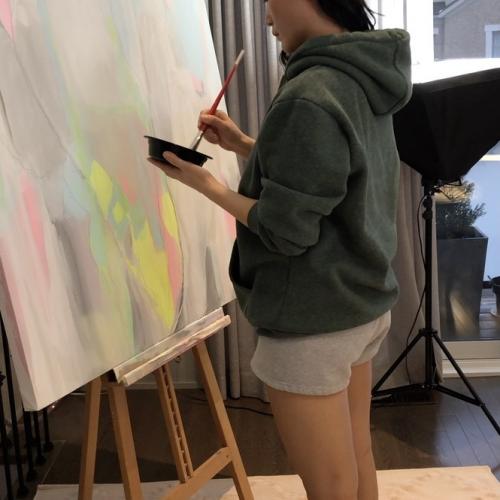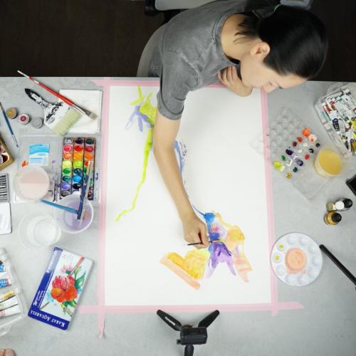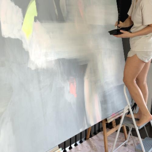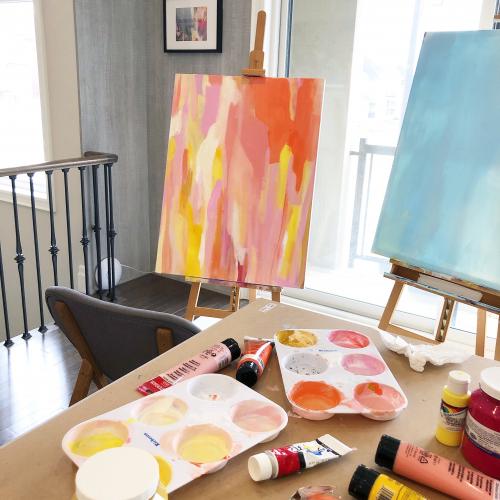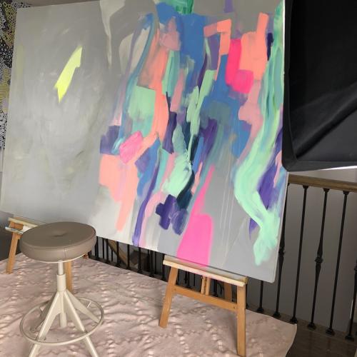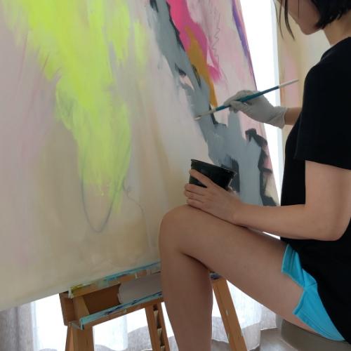 Her collection of artwork utilizes bold and fresh colours on large multimedia canvases, as well as vibrant watercolour originals.